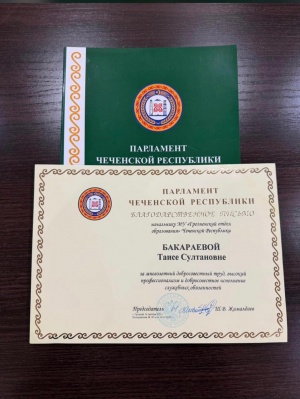 О вручении Благодарственного письма Парламента Чеченской Республики за многолетний добросовестный труд, высокий профессионализм и добросовестное исполнение служебных обязанностей